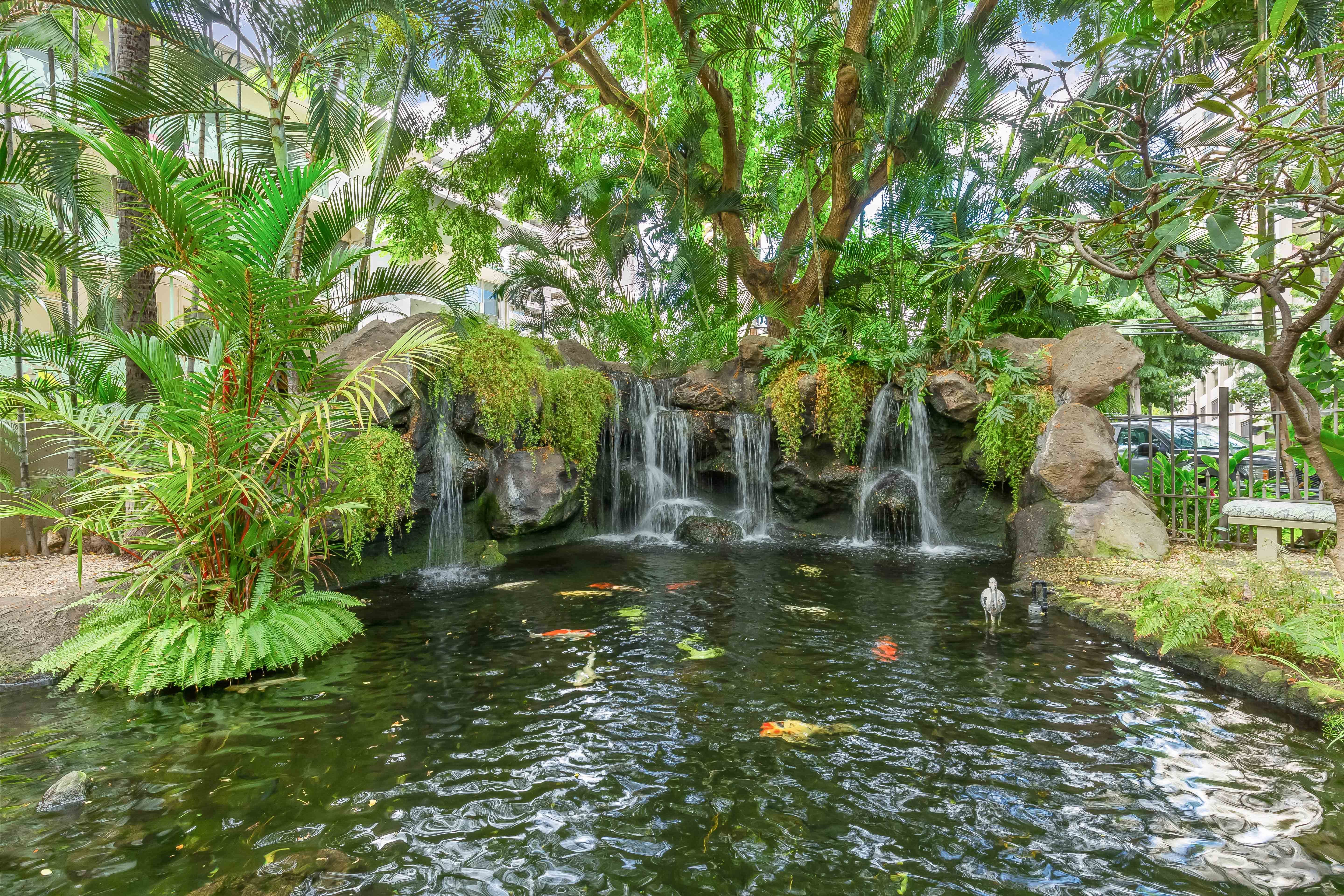 Welcoming waterfall at the building entrance