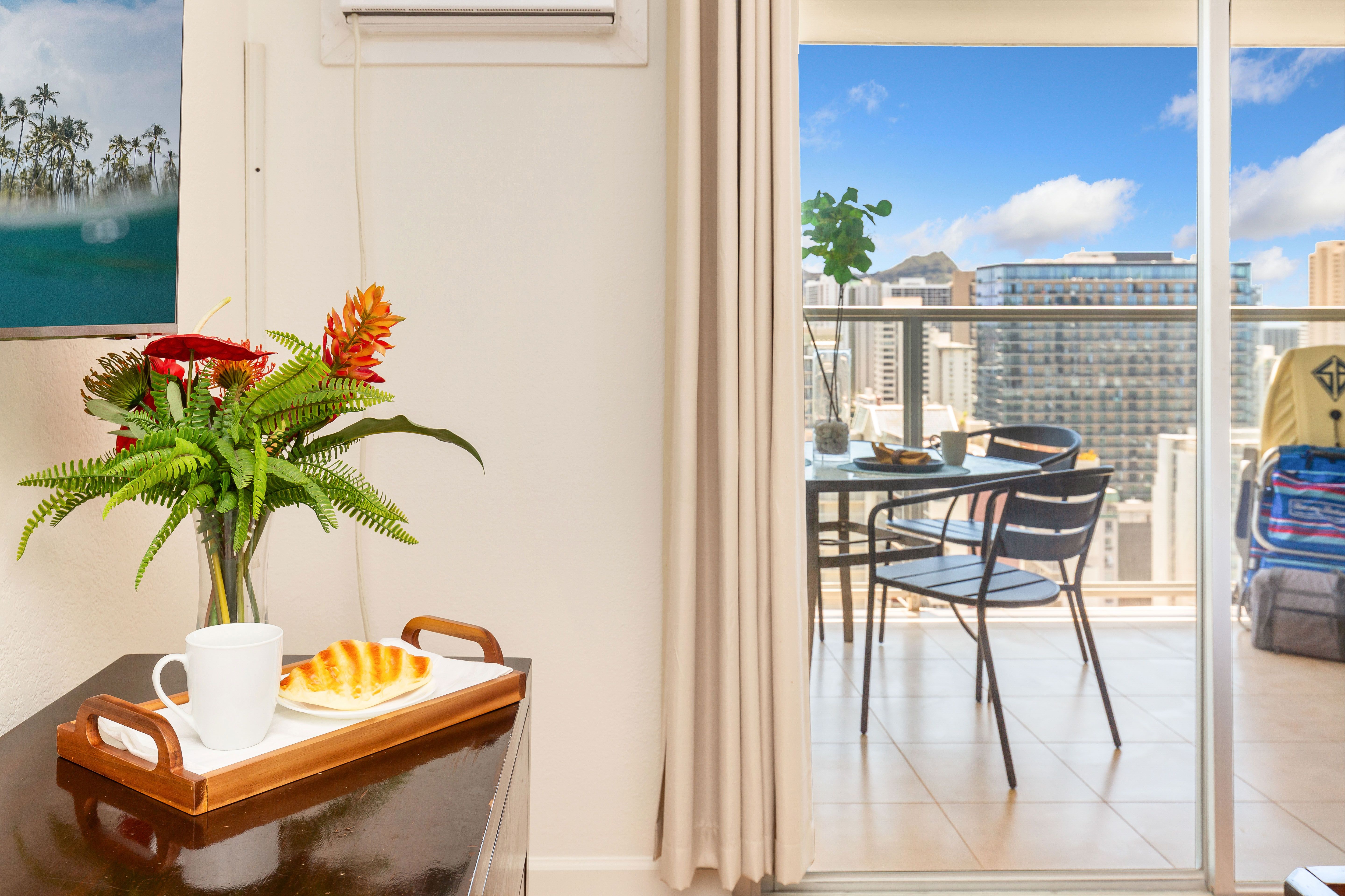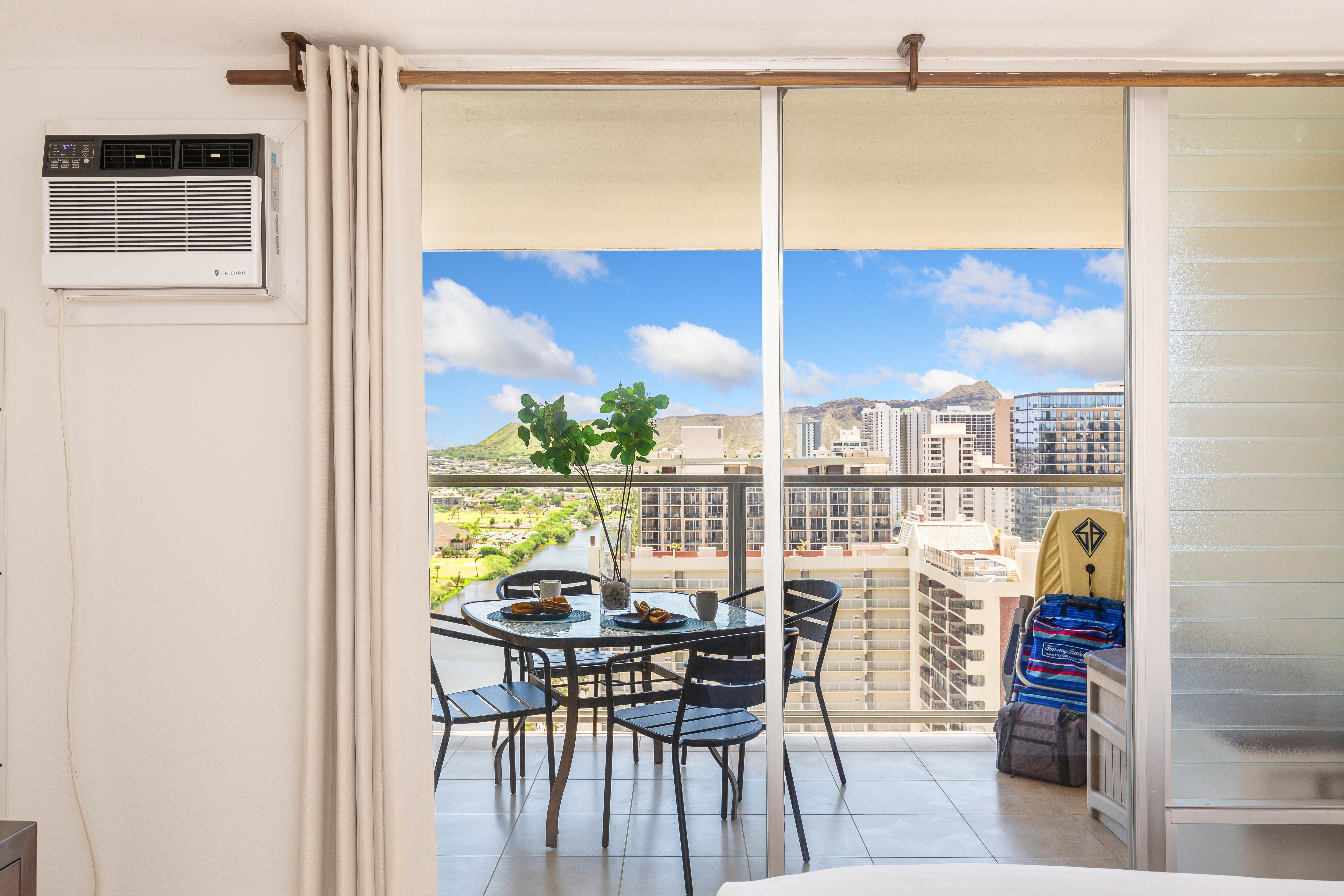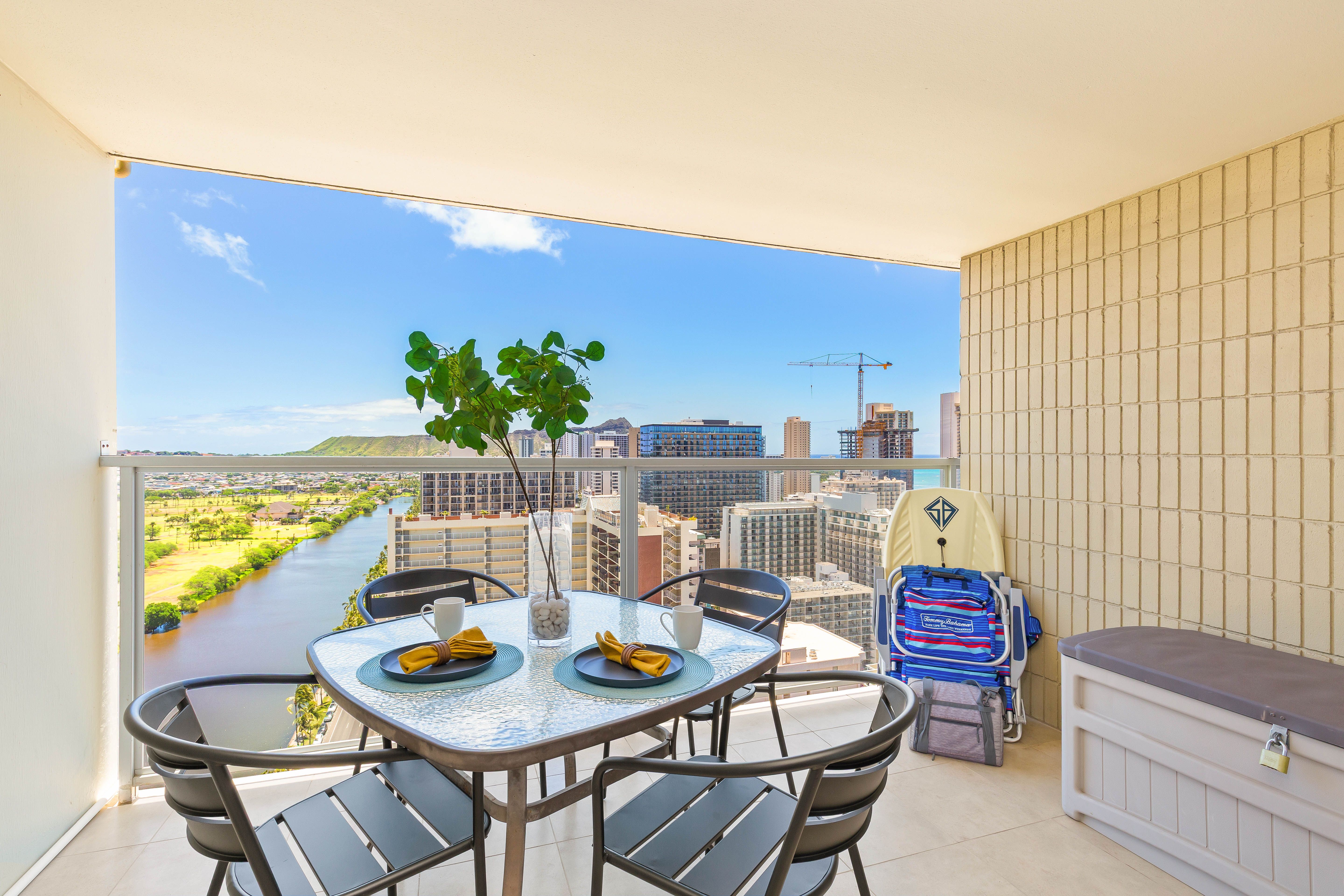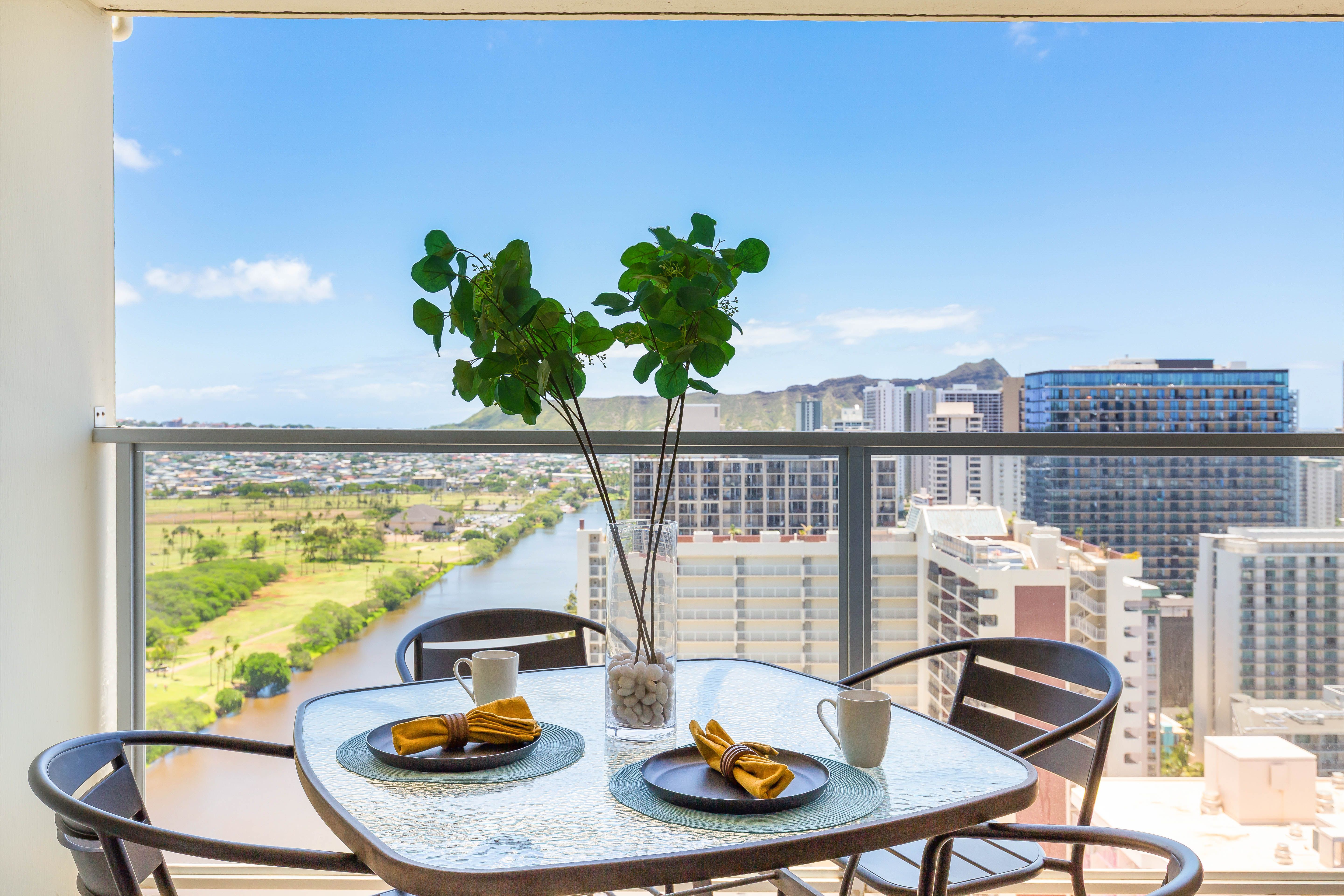 Relax on the balcony with stunning views of the Ala Wai Canal