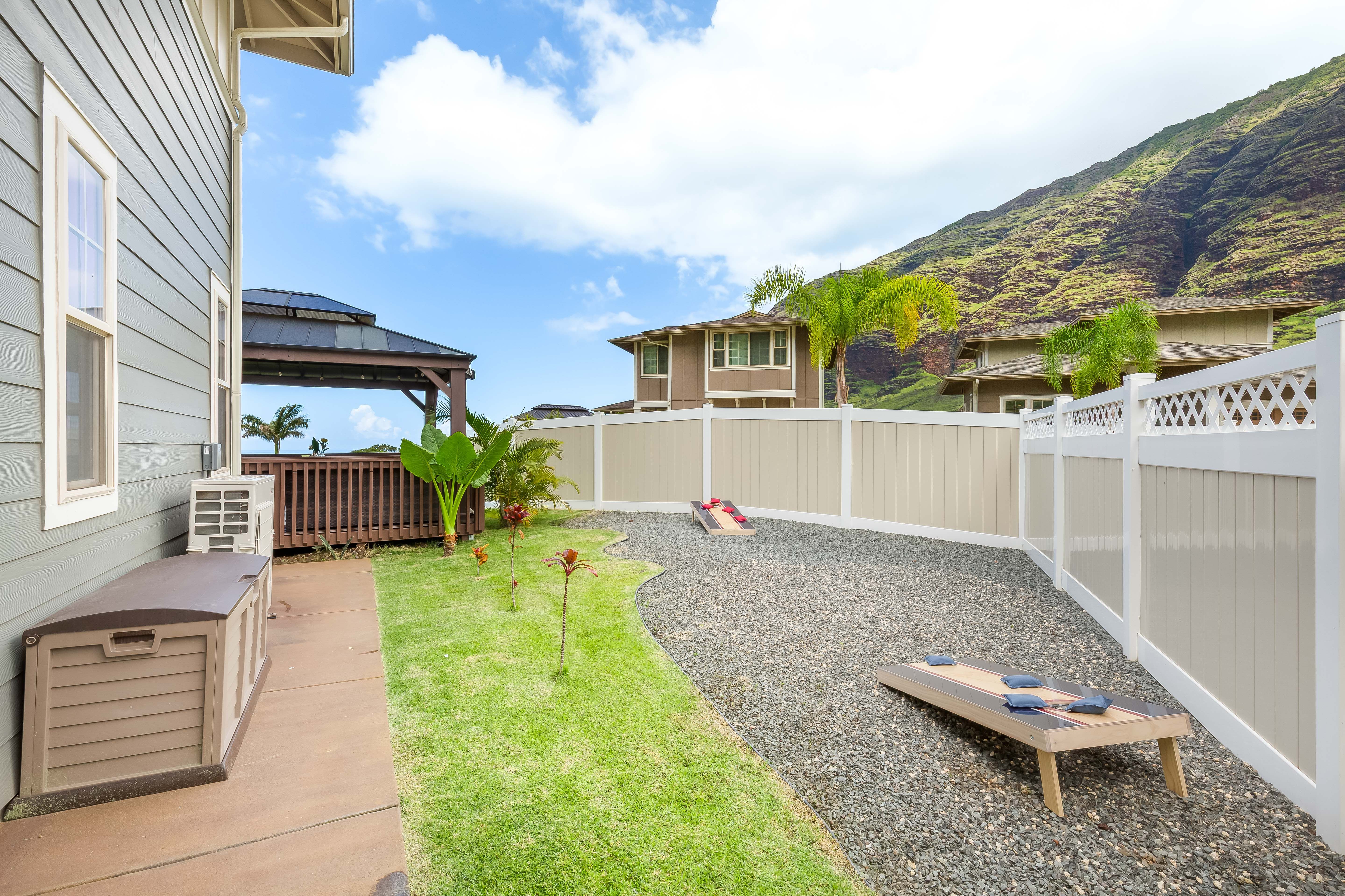 Challenge your friends to a game of cornhole in the outdoor area