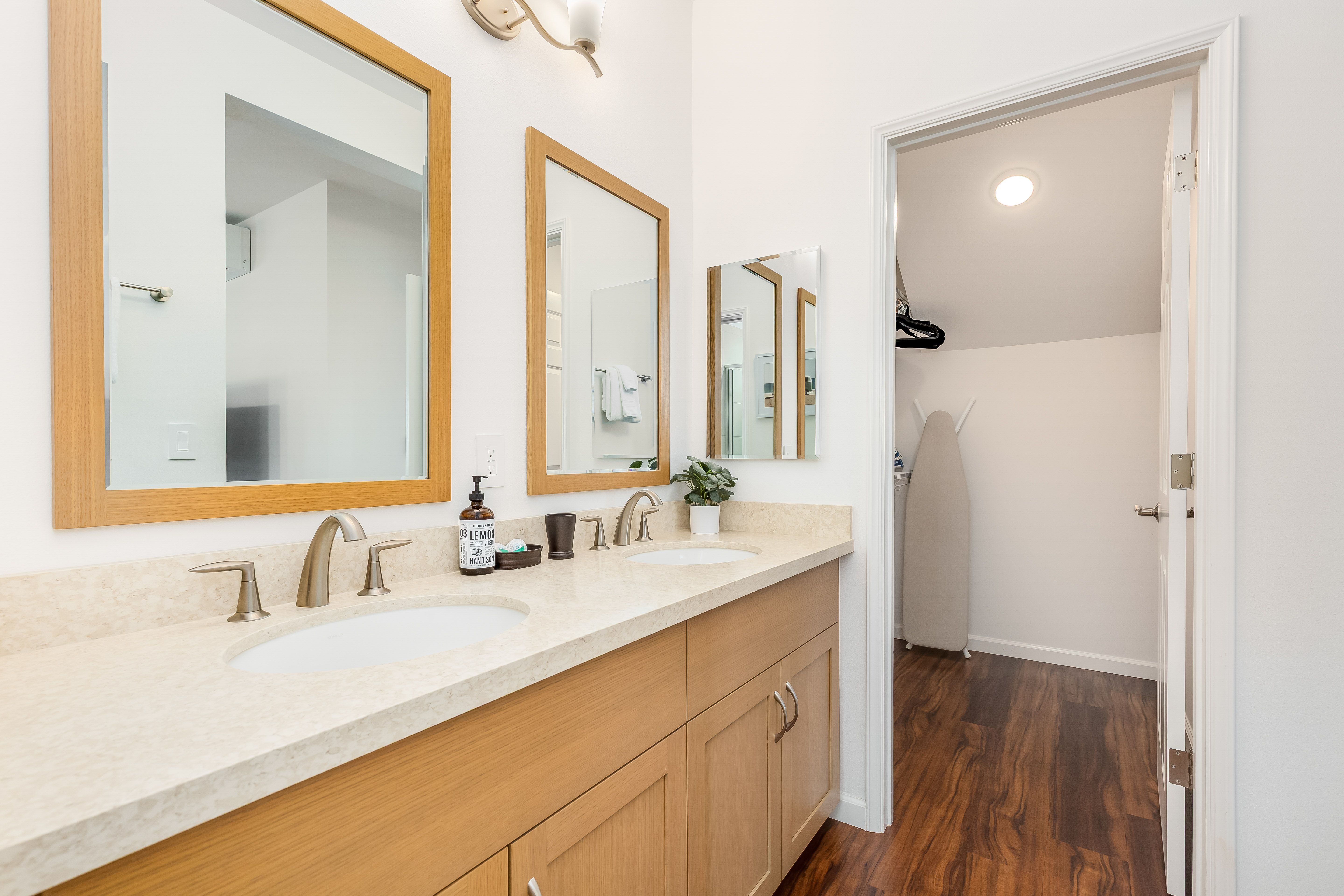 Master bathroom with double sinks and a large walk-in closet