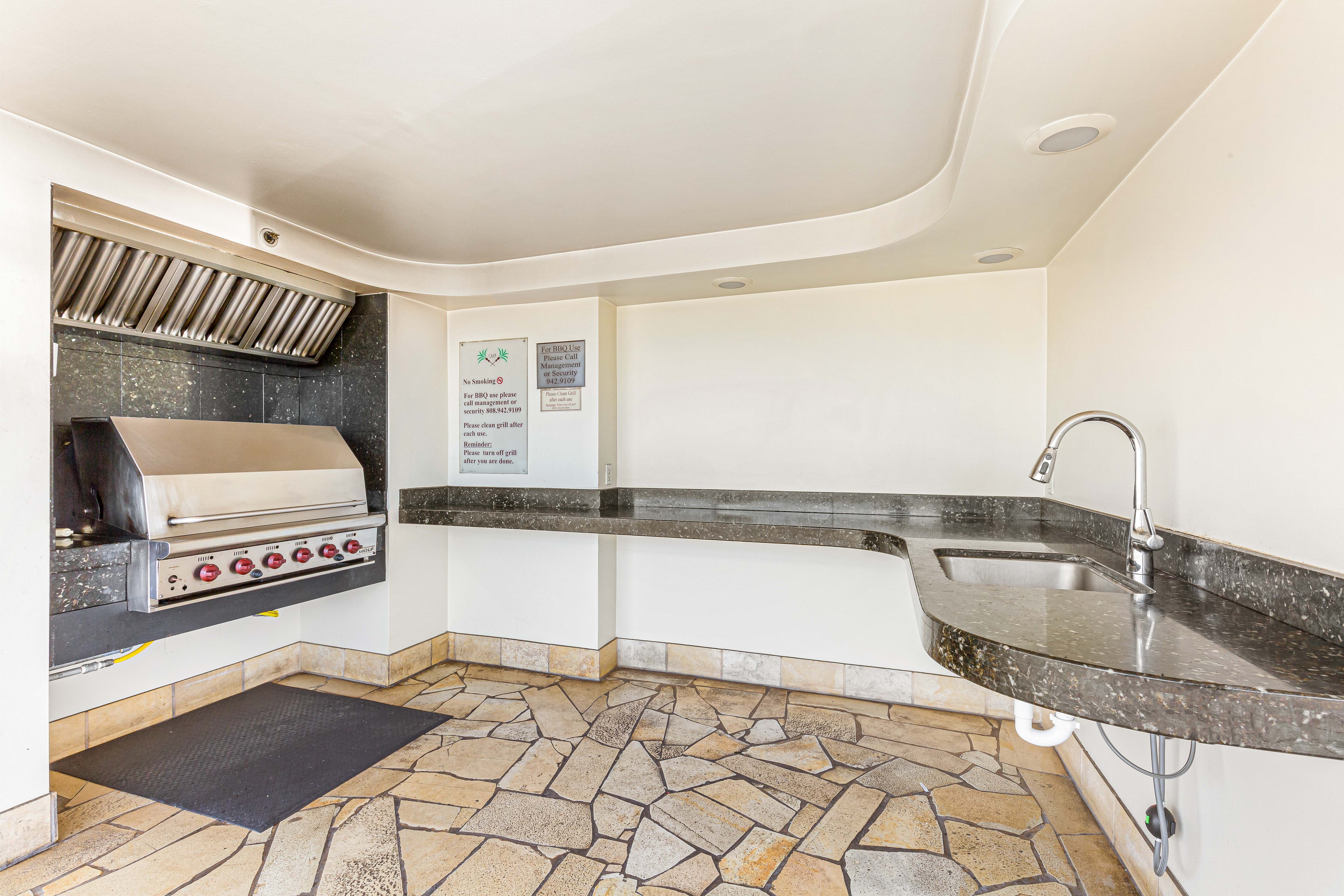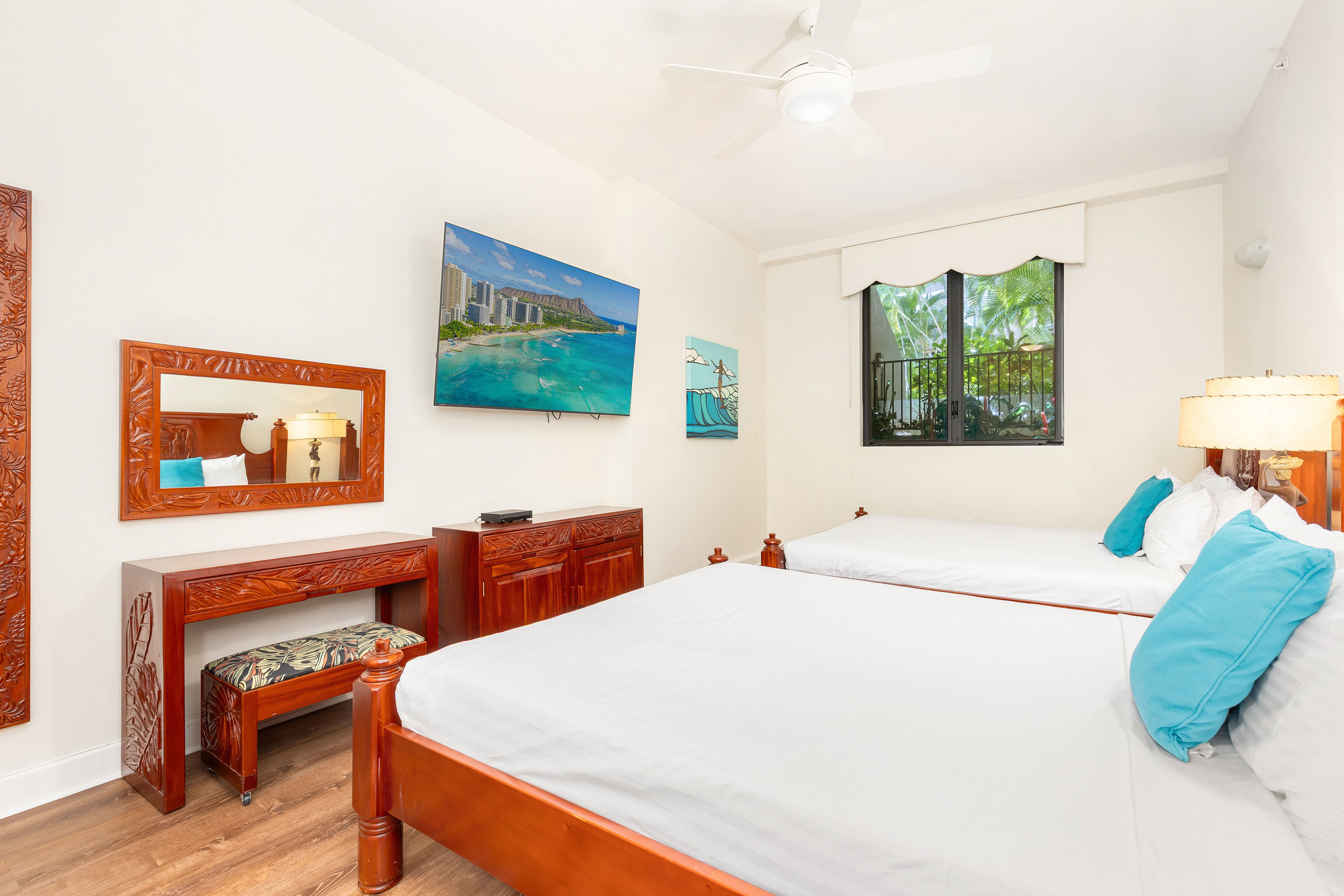 Luxurious Waikiki Ground floor condominium in prestigious Windsor Waikiki. This 2 bedroom and 2.5 bathroom spacious ground level loft style condo where the new renovation mixed with Hawaiian furniture makes you feel at home. There is an ensuite bathroom in each Bedroom, a full modern kitchen, FREE parking stall, and did we mention the large lanai? Its steps away form the pool deck and BBQ area, yet it is secluded enough to have your own relaxing oasis. Feel at home with a washer/dryer inside the condo, A/C, HD cable TV, FREE high speed internet! There is even a secret bedroom upstairs that can sleep 2 more guest if needed. Windsor is on the West edge of Waikiki making it more secluded but close enough to be experience Waikiki's "City Life." It is a short 5 minute walk to the world famous Waikiki Beach. The building itself was once a hotel and the perks that go with that are the Pool, Jacuzzi and full gym to work out in. The main attraction of this condo is the rooftop Sky Terrace and our guest can watch the Friday night fireworks from the Hilton Hawaiian Village!
